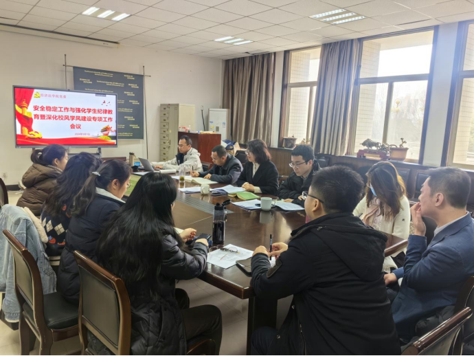 在长安校区资料室召开安全稳定与强化学生纪律教育暨深化校风学风建设专项工作会议,学院党委委员、领导班子成员、党支部书记、全体行政干部、辅导员参加,会议由党委书记李建梅主持。