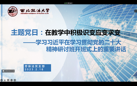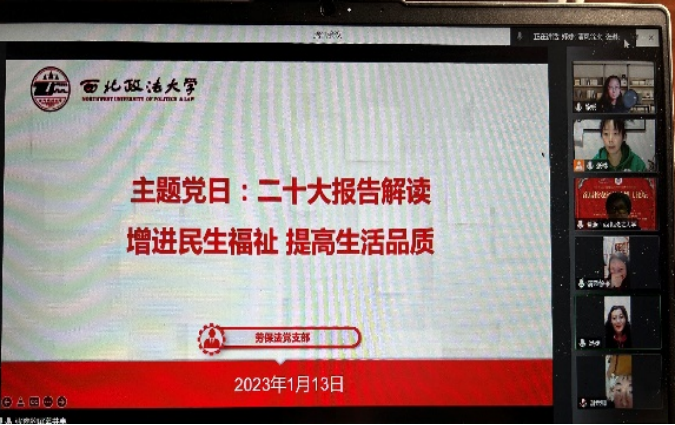 2023年寒假期间,劳保法党支部通过腾讯会议形式按期开展两次主题党日活动,活动主题分别为“二十大报告解读:增进民生福祉提高生活品质”和“在教学中积极识变应变求变——学习习近平在学习贯彻党的二十大精神研讨班开班式上的重要讲话“,会议由支部书记张琳主持,全体党员参加。