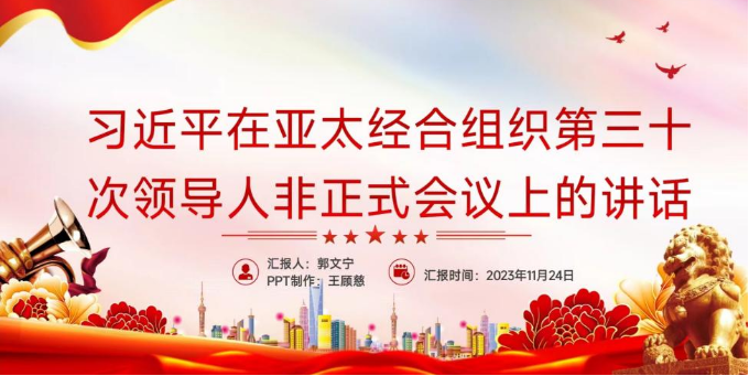 郭文宁同志从四个方面总结了习近平总书记在2023年亚太经合组织(APEC)领导人非正式会议《坚守初心 团结合作 携手共促亚太高质量增长》的重要讲话:首先是创新驱动。习近平主席强调创新是发展的强大动力,要顺应科技发展趋势,以更加积极姿态推动科技交流合作。其次是开放导向,要反对将经贸问题政治化、武器化、泛安全化,中国中国成功举办第三届“一带一路”国际合作高峰论坛,也通过实际行动践行开放导向。再次是绿色发展,中国坚持走生态优先、绿色发展之路,积极稳妥推进碳达峰碳中和,加快发展方式绿色转型。最后是普惠共享,要全面落实联合国2030年可持续发展议程,推动发展问题重回国际议程中心位置,深化发展战略对接,共同解决全球发展赤字。