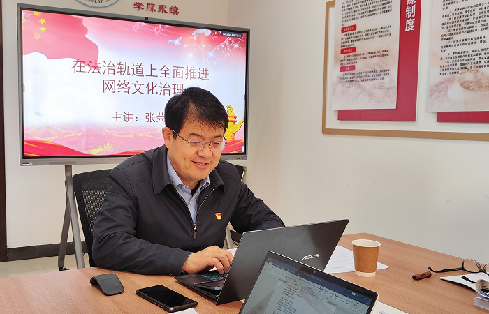 全体与会人员首先集体学习了《关于加强新时代法学教育和法学理论研究的意见》,习近平总书记关于以学铸魂、以学增智、以学正风、以学促干的重要论述。之后,张荣刚同志以《在法治轨道上全面推进网络文化治理》为题为全体与会人员上了既有理论深度,又有现实指导意义的党课。课后,李建梅同志、党支部成员以及教研室李艳老师就集体政治理论学习和党课的内容做了研讨发言。同志们还联系知识产权数据库建设、知识产权专业硕士点建设等议题进行了交流发言。最后孙栋同志做了总结,他首先感谢张荣刚同志精彩的授课,并倡议支部全体成员将本次活动中获得的灵感、得到的措施实际用于工作中难题的解决。近17时许,本次党建活动在热烈的氛围中结束。