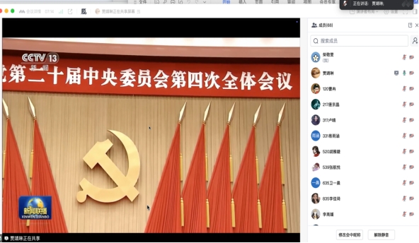全体成员通过视频的方式深入学习了党的二十届四中全会精神,支部预备党员贾靖琳领学《习近平谈治国理政(第五卷)》中《以政法工作现代化支撑和服务中国式现代化》相关内容,姜畅畅、郭嘉祺、王丹阳结合学习生活实际分享了学习心得。