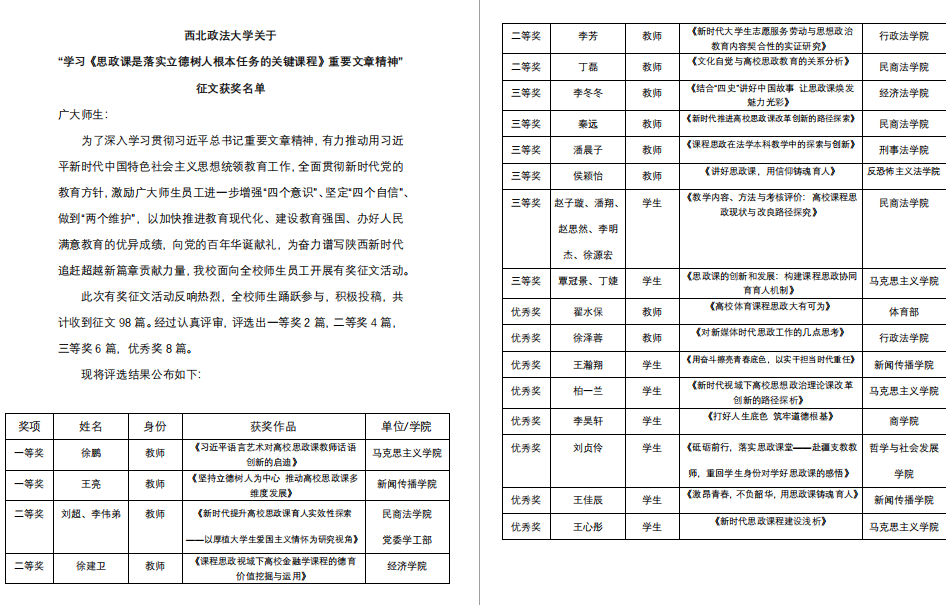 近日,我校公布了关于“学习《思政课是落实立德树人根本任务的关键课程》重要文章精神”征文获奖名单,有爱爱 2017级辅导员李冬冬提交文章《结合“四史”讲好中国故事 让思政课焕发魅力光彩》获得三等奖。