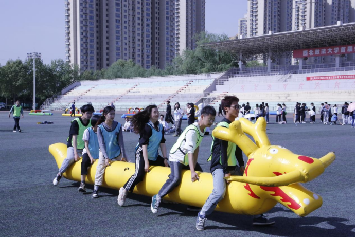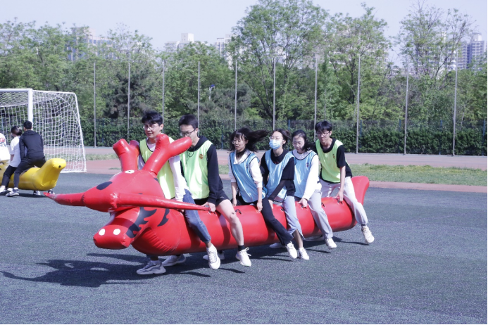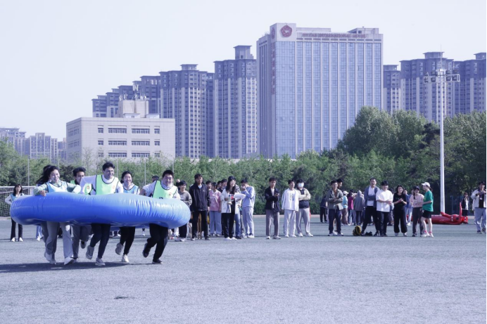 比赛第一项为“八仙过海”。只见六名队员紧抓气垫道具立于起跑线后,裁判一声令下,他们似离弦之箭向前冲刺,折返后和另外六名队员迅速交接,接力下一段奔跑。大家配合默契,劲儿往一处使,风声呼啸而过,活力与青春在此刻被诠释得淋漓尽致。