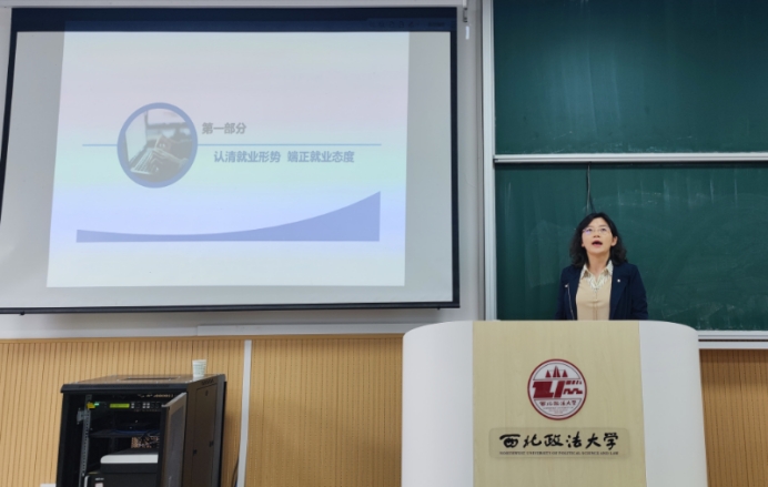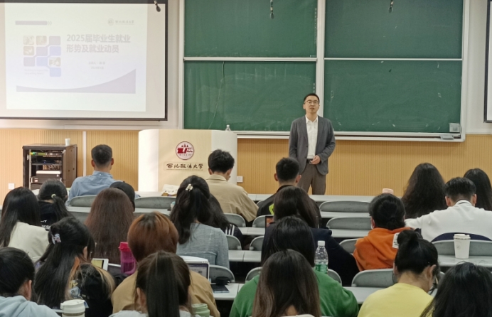 在长安校区天平楼AJ13教室召开2021级学生就业指导会。学院邀请招生就业处学生就业指导中心副主任薛倩老师主讲2025届毕业生就业形势分析与就业指导。学院党委副书记李恒、辅导员李冬冬和2021级本科生230余人参加会议。
