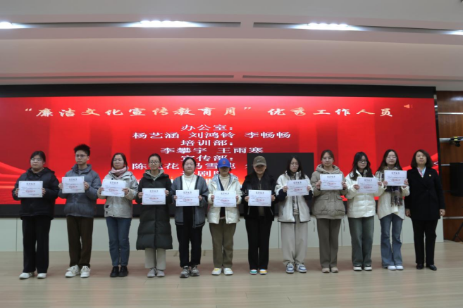 随后,进行了廉洁文化宣传教育月的总结表彰。今年廉洁文化宣传教育月自启动以来,得到了校纪委、党委宣传部的大力支持。活动期间,以“廉韵扬正气,洁行树新风”为主题,举办了第十届海峡两岸法律文化周——《话说张汤》话剧展演活动、“正气话廉洁,清风拂面来”校园广播栏目与轻听推送特辑、“洁行传美德,廉语暖民心”社区廉洁文化宣讲与志愿服务活动、“清韵传承、德馨盈校”家乡廉洁故事分享短视频大赛、“廉韵筑梦、清风扬帆”廉洁文化征文大赛、廉亭大讲堂等活动,数余名师生参与到活动中来,营造了学廉、崇廉、尚廉的良好氛围,有效传递了反腐倡廉的正能量。