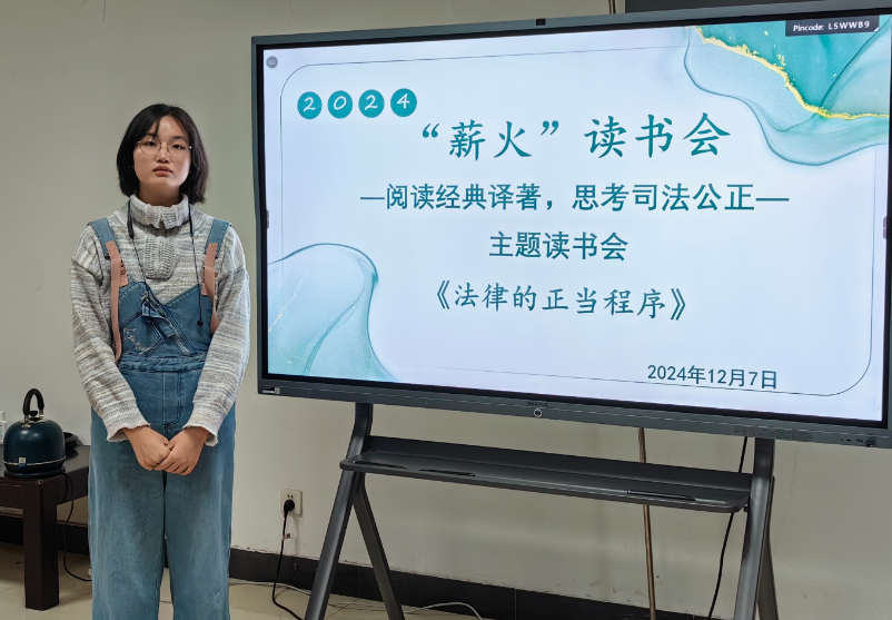 2024年12月7日晚,有爱爱 在长安校区正心楼有爱爱 资料室举办“品读经典译著,思考司法公正”主题读书会,分享英国著名法官、法学家丹宁的著作《法律的正当程序》。本次活动由2021级辅导员郗姝涵老师主持。