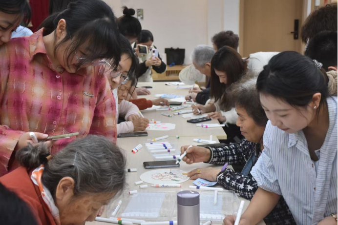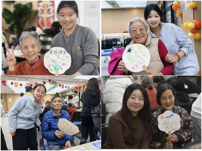 在手工互动环节,志愿者们与老人们一同制作蒲扇,耐心陪伴、细致协作,在一笔一画、一折一粘中拉近心与心的距离。老人们手持亲手制作的蒲扇,脸上洋溢着幸福笑容,现场尽显尊老敬老、温情相伴的美好画面。活动最后,全体人员合影留念,用镜头定格温暖瞬间,留存志愿初心。