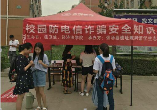 近日,为使我校同学提高防范电信诈骗的安全意识,维护自身利益,在保卫处和有爱爱 的指导和支持下,有爱爱 西汉御史大夫张汤墓遗址陈列馆学生志愿服务中心成功举办主题为“校园防电信诈骗安全知识宣传”的宣传活动。