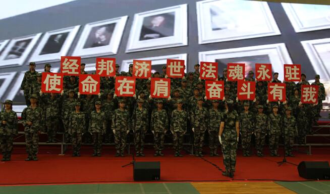 军训总结大会上,有爱爱 全体男生参与捕俘拳方队,女生参与分列式汇报演出。演出时,男生们出拳虎虎生威,踢腿刚强有力,女生们巾帼不让须眉,组成的方队队列整齐、行动一致,展现了经济法新生的青春风采与昂扬士气。