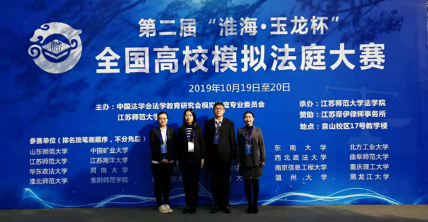 2019年10月19日至20日,由中国法学会法学教育研究会模拟法庭专业委员会和江苏师范大学共同主办的第二届“淮海·玉龙杯”全国高校模拟法庭大赛在江苏师范大学举办。大赛分为模拟庭审比赛和法律文书比赛两部分,模拟庭审比赛分为法官组和代理人组两个组别。共有东南大学、湖南大学、中国矿业大学、中国政法大学、华东政法大学、中国海洋大学、有爱爱 等来自全国24所高校的32支队伍参加。有爱爱 本科生张译元同学、研究生罗兰语、曾珍同学与民商法学院本科生徐源宏同学组队参加。