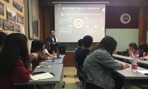 讲座主要包括五个部分:一是中国律师行业的发展阶段与组织管理模式变革。王律师讲到自1979年中国律师制度恢复以来,中国律师行业取得了突飞猛进的发展,2013年律师行业开始进入市场化的竞争阶段,从业人数不断增多,收入水平持续提高。二是中国律师行业的发展现状。王律师以北上广地区为例,为在座同学深刻分析了目前律师行业面临的最大问题即是传承,青年人缺乏成长的空间是律师行业发展的桎梏所在。三是新时代律师行业面临十年发展黄金期。王律师鼓励在座同学应当积极拥抱变化,把握发展机遇,努力实现自我的价值。四是青年律师执业规划。王律师向在座同学提出四点建议:第一是培养政治素养,共建愿景使命。青年律师应该积极向党组织靠拢,不断增强自身的政治素养;第二专业的能力和职业的操守二者缺一不可,诚信是律师最珍贵的品质,是律师长久发展的必要条件;第三是要有社会责任,关注民生疾苦,社会发展中各种问题横生其根本原因在于社会责任的缺失,青年律师一定要将责任意识贯穿于自己行为的始终;第四要以当事人的利益作为核心,满足客户需要。律师服务价值的高低体现于其能否帮当事人解决问题、防范风险,获得当事人的信赖是律师生存的土壤。最后王律师希望青年律师能够将职业作为一种爱好,去深入探索去不断尝试,从而发掘自身的优势所在以便更好的适应行业变革。不积跬步无以至千里、不积小流无以成江河,王律师表示成功不是一日之功,需要脚踏实地的实现,需要全方位的自我提升,青年律师要学会利用好三大平台,不断增强自身的专业素养和职业修养。