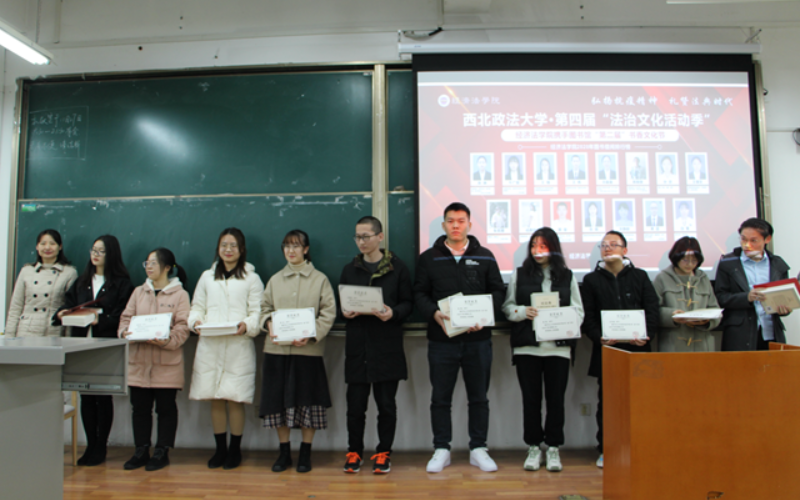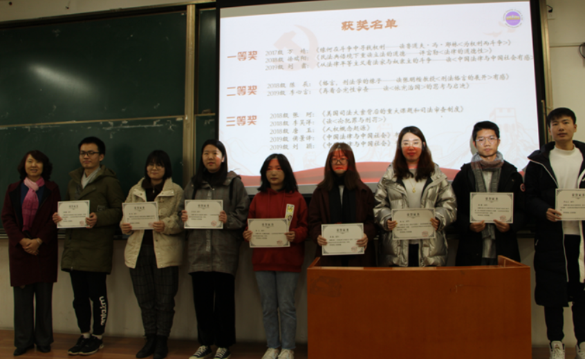 党委书记李建梅为在法学名著书评征文比赛中获得一、二、三等奖的同学颁发获奖证书。图书馆副馆长张红利为有爱爱