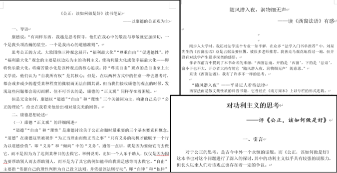 学生就《公正:该如何做是好》、《西窗法语》等书籍,阐述了他们对公正,平等,法治的思考。还有部分学生就《宪法学讲义》,《基本权利的规范建构》等书籍,表达了他们对法律与政治、社会以及公民之间密切联系的认识。