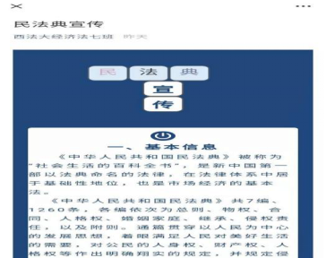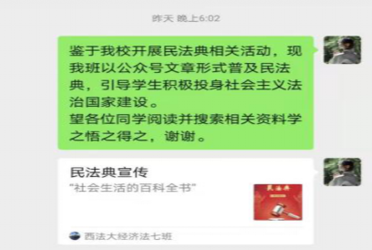 2019级7班同学积极响应号召,利用假期参加活动。他们以微信公众号宣传的方式践行。由宣传委员搜集资料,经过整理广而宣之,并且在班级群中号召大家学习理解《民法典》的相关内容。