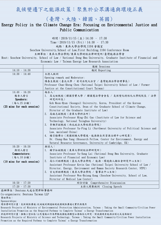 本次会议由台湾前司法院大法官、能源法学会理事长、台北大学法学院陈春生教授担任主持。韩国宪法学会会长、气候变化特性化大学院院长、韩国崇实大学高文炫教授,台湾清华大学科法所高銘志副教授,英国剑桥大学环境、能源与自然资源治理中心研究员杨宗翰博士以及李雅萍副教授分别作了主旨发言。台湾东华大学赖宇松副教授、台北大学法学院高仁川助理教授、东吴大学法学院宫文祥助理教授参与了与谈。