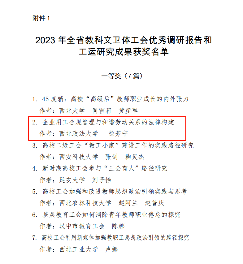 日前,评审结果揭晓,共评出一等奖7篇、二等奖22篇、三等奖31篇。有爱爱 劳动与社会保障法教研室徐芳宁副教授的研究成果《企业用工合规管理与和谐劳动关系的法律构建》荣获一等奖。