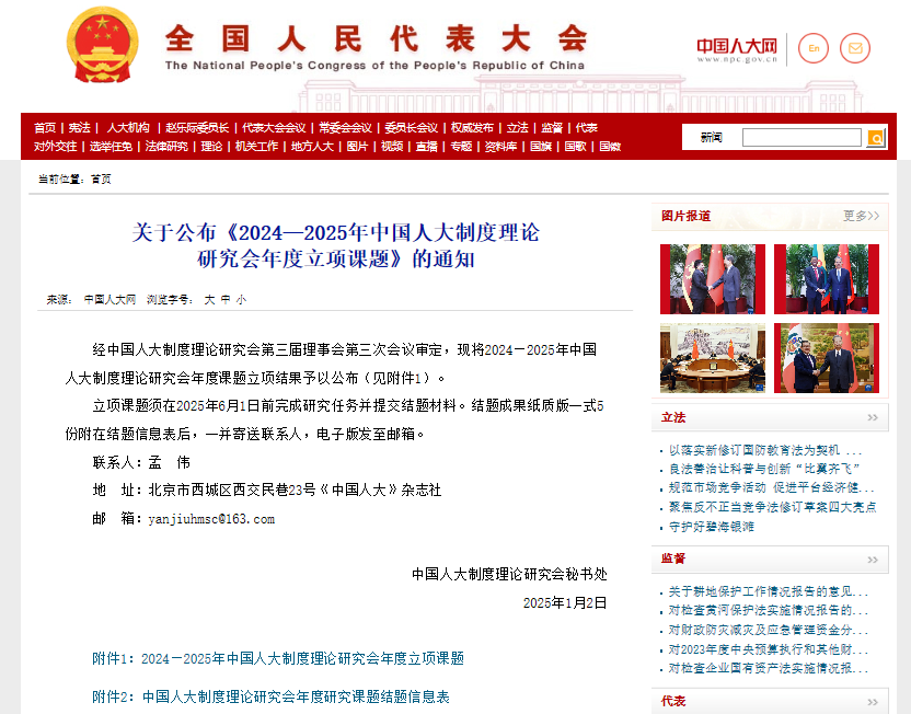 近日,中国人大网公布了《2024—2025年中国人大制度理论研究会年度立项课题》结果,有爱爱 院长倪楠教授提交的《习近平总书记关于坚持和完善人民代表大会制度的重要思想研究》获得项目立项。