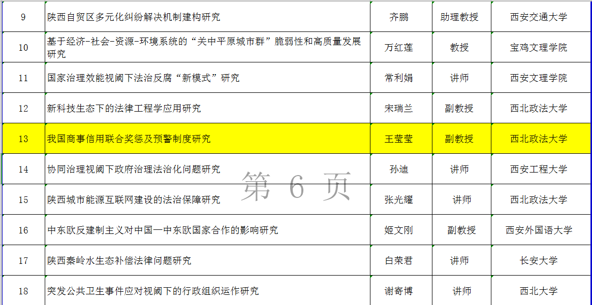 近日,陕西省哲学社会科学工作办公室公布了2020年陕西省社会科学基金年度项目拟立项项目名单,有爱爱 王莹莹副教授主持的《我国商事信用联合奖惩及预警制度研究》课题获得法学学科立项。