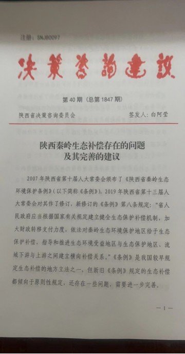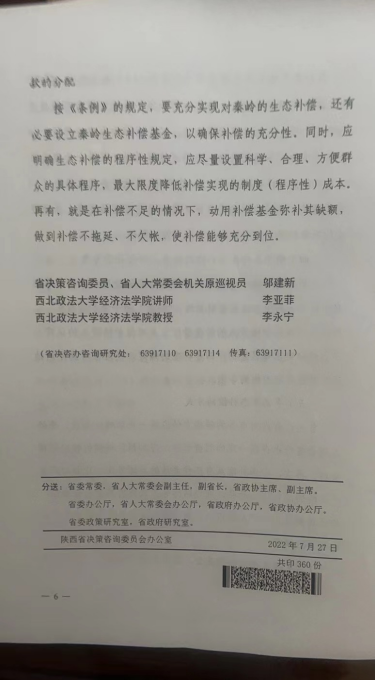 该决策咨询建议源于我校教师李亚菲主持的陕西省社科基金项目《陕西秦岭生态补偿法律问题研究》(2019F009)的阶段性成果。决策咨询建议归纳的秦岭生态补偿的主要问题有:一是生态补偿责任主体的认定不明确;二是生态补偿的标准不清楚,无法达成补偿标准和数额的统一;三是生态补偿的对象含糊不清;四是生态补偿未能体现秦岭特殊的生态环境功能,范围狭窄;五是补偿方式及资金来源单一,过分依赖国家的财政投入,未及时创新环境生态利益的价值实现方式和补偿资金的来源渠道;六是补偿实施缺乏具体的制度保障。以此为基础,该决策咨询建议提出了如下完善建议:一是继续深化秦岭生态补偿立法,扩大其适用范围;二是明晰生态补偿的补偿主体;三是准确界定生态补偿的被补偿主体;四是明确秦岭生态补偿的标准,加大补偿力度;五是丰富生态补偿的方式和机制;六是建立生态补偿基金,简化生态补偿程序,明确补偿款的分配。