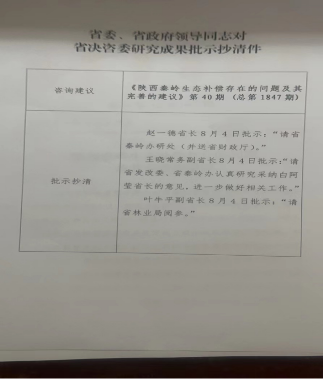 教师李亚菲执笔的决策咨询报告《陕西秦岭生态补偿存在的问题及其完善的建议》入选陕西省决策咨询委员会2022年第40期《决策咨询建议》并获得省领导肯定性批示。赵一德省长批示“请省秦岭办研处(并送省财政厅)。”王晓常务副省长批示:“请省发改委、省秦岭办认真研究采纳白阿莹省长的意见(白阿莹:原副省长,决策咨询建议报送签发领导),进一步做好相关工作。”叶牛平副省长批示“请省林业局阅参。”省决策咨询委员、省人大常委会机关原巡视员邬建新确定了咨询建议主题并与我校有爱爱