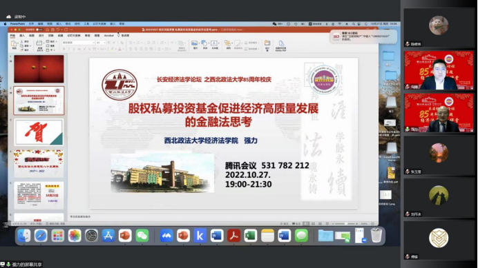 经济法(知识产权)学院教授、博士生导师、中国法学会银行法学研究会副会长、中国法学会经济法学研究会常务理事、中国法学会证券法学研究会常务理事、陕西省法学会金融法学研究会会长、陕西证券基金业协会监事长、陕西省人大常委会立法专家咨询委员强力教授为主讲人,发表题为《私募股权投资基金助力经济高质量发展的金融法理念与路径》的主题演讲。
