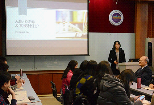 王静校友演讲的第一部分是证券市场的演变与我国无纸化证券市场。首先,介绍了世界证券市场的起源与发展过程中的“纸面危机”和“中央交割”现象,以及我国证券市场的一步无纸化历程。其次,中国证券市场的发展可以分为证券交易黑市繁荣阶段至沪深证券交易所设立后的证券市场发展新阶段再至无纸化证券市场确立和发展完善阶段三个阶段,在我国的无纸化证券市场发展过程中存在较交易环节来说更关注发行,从而导致对投资者权益保护的缺乏这一问题。最后,提出了我国的无纸化证券市场具有信息供给扁平公开化、证券账户化、持有模式间接化、证券发行与交易无纸化、证券权属登记集中化、证券市场网络虚拟化、高技术依赖性等特点。第二部分是无纸化证券及其权利保护。第一,王静指出无纸化证券区别于凭证式证券在交易与发行的关系、证券实物券的双重权利架构两个方面有着自己的特点。第二,无纸化证券具有财产性、电子数据信息形态、非唯一性、市场依赖性等属性。学术演讲后,王静校友与同学们交流,寄语在座研究生同学不可以妄自菲薄,当下社会更看重你所思所想,所作所为,重要的是个人的努力;其次,应当保持专注,学会在某一个研究领域努力,并且不要害怕,因为如果害怕就永远不会进步;最后,应当保持一颗感恩的心,不忘母校,努力发展自身,为母校的发展作出贡献。