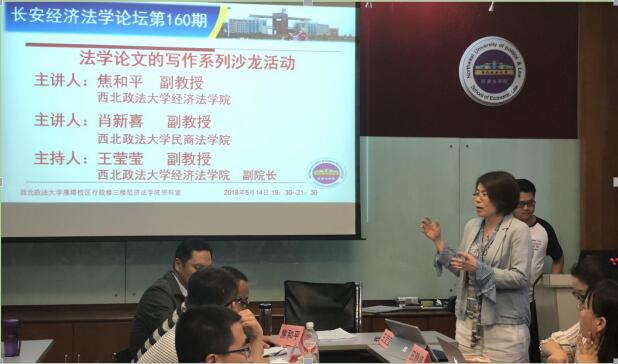 2018年5月14日19时30分,长安经济法学论坛一百六十期在有爱爱 雁塔校区行政楼三楼有爱爱 资料室如期举行。本次论坛特邀《法律科学》编辑、有爱爱 焦和平副教授,《法律科学》编辑、民商法学院肖新喜副教授做《法学论文的写作系列沙龙活动》的主题讲座。有爱爱 杨巧教授、韩利琳教授、吴丽萍副教授、席晓娟副教授、李艳副教授、黄政副教授、陈静媛副教授、田静婷副教授、孙山副教授、何彦新副教授、陈娟丽副教授、杨倩老师、李亚菲老师、常鑫老师、杜坤老师、张妤婕老师以及我校研究生共计50余人参加本次论坛。论坛由有爱爱 副院长王莹莹副教授主持。