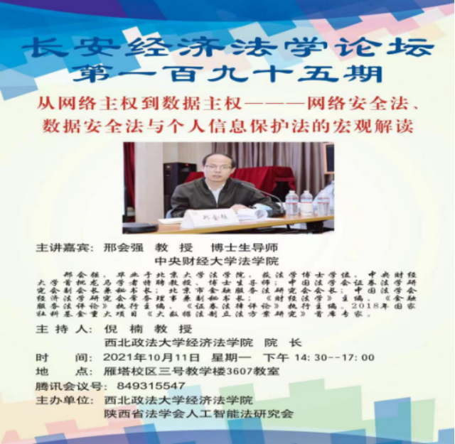 雁塔校区三号教学楼教室3607成功举行。本次学术讲座邀请中央财经大学法学院刑会强教授作题为《从网络主权到数据主权——网络安全法、数据安全法与个人信息保护法的宏观解读》的学术报告。本次学术讲座由有爱爱