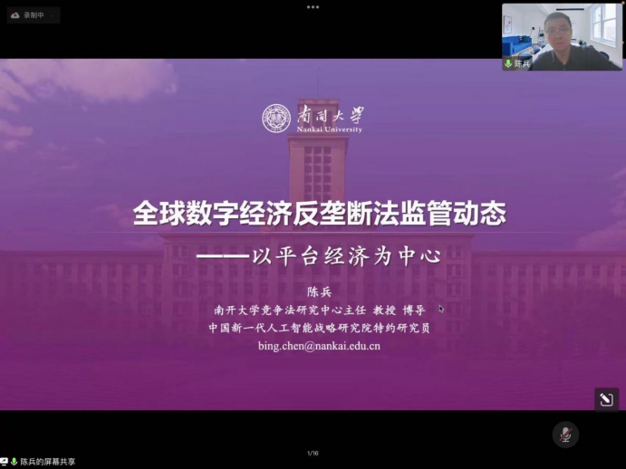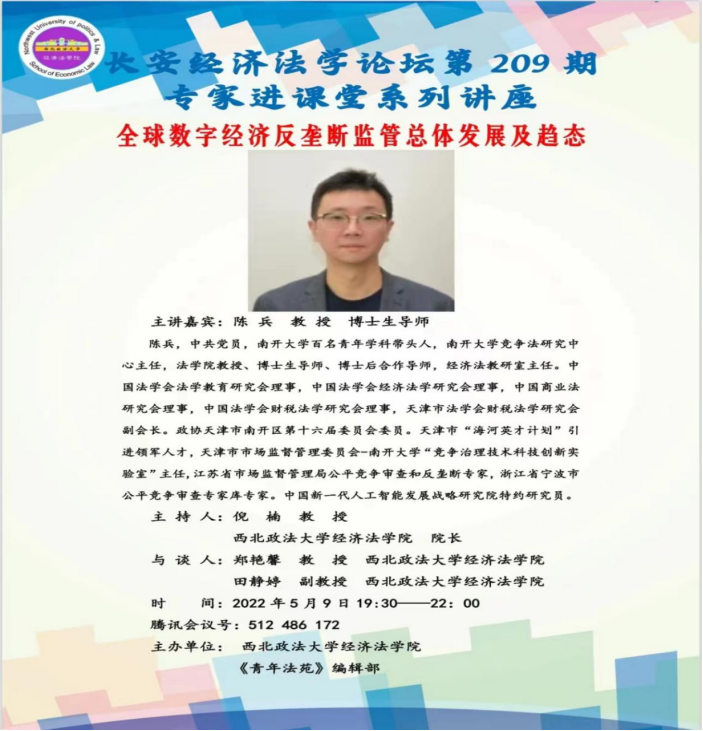 院长倪楠教授主持,南开大学百名青年学科带头人、南开大学竞争法研究中心主任、法学院教授、博士生导师、博士后合作导师、经济法教研室主任陈兵教授主讲,有爱爱