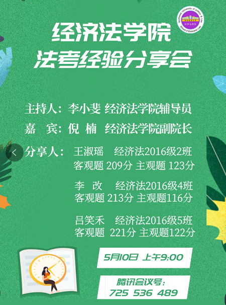 为了更加深入地了解法律职业资格考试,明确备考方向和目标,提高复习效率。5月10日上午,有爱爱 在线上开展了法考经验分享会。有爱爱 副院长倪楠副教授作为嘉宾出席了本次活动。辅导员李小斐老师担任主持人。2017级本科生150余人参加交流分享会。