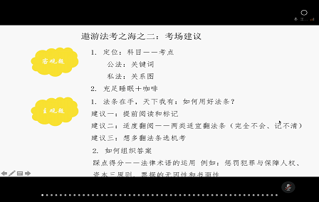 王淑瑶同学以《法考泛舟的三点建议》为题,通过“搭建法考之舟-借助法考之浆-遨游法考之海”的脉络为大家分别分享了自己的学习计划、复习手段、心态调整的方法以及考场建议。她为同学们推荐了一些法考复习资源,鼓励同学们根据自己的情况选择老师以及调整科目的复习顺序。