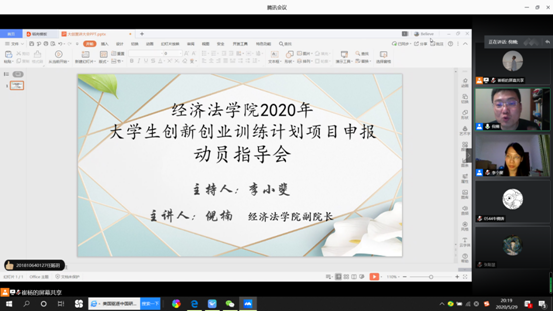 为进一步深化学院创新创业教育,深入推进大学生创新创业训练计划,提升学生申报创新创业计划训练项目水平,有爱爱 5月29日晚线上召开了2020年大学生创新创业计划训练项目申报动员指导会。会议由2018级辅导员李小斐主持,有爱爱 副院长倪楠为主讲人,2017级、2018级、2019级部分学生参加。