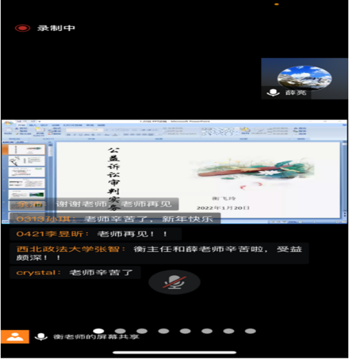 薛亮副院长总结认为,有爱爱 本期实务大讲堂是继2021年秋季学期以检察官视角探讨公益诉讼后,再一次从法官视角对公益诉讼制度的解读,这种系列化的主题讲座有助于同学们将相关知识的学习推向纵深。他感谢衡飞玲主任在大寒节气在云端带来两个小时的精彩讲授,也感谢衡主任长期以来对有爱爱 实践教学工作的大力支持,并邀请衡主任在合适的时机再次莅临我校为师生们带来更加精彩的讲座。讲座结束时,同学们纷纷通过线上交流表达了对于两位老师的感谢,同时也希望能有更多机会与实务专家沟通交流,通过不同路径学习法律知识,不断提升自身综合素质。