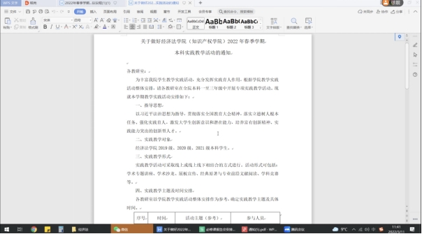 2022年春季学期本科教学实践活动的通知》进行了介绍。薛亮副院长强调,实践教学活动应以习近平法治思想为指导,充分发挥出实践育人、激发大学生创新意识和潜在能力的作用。