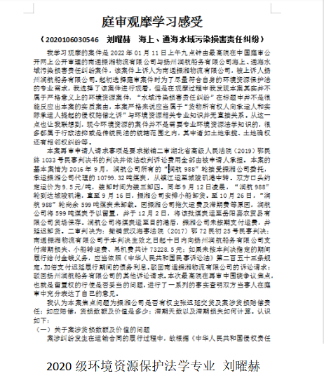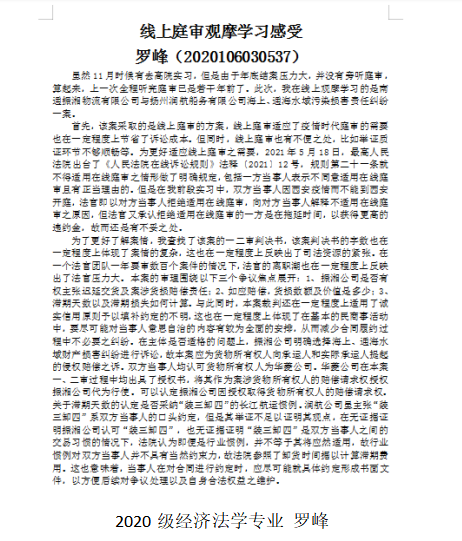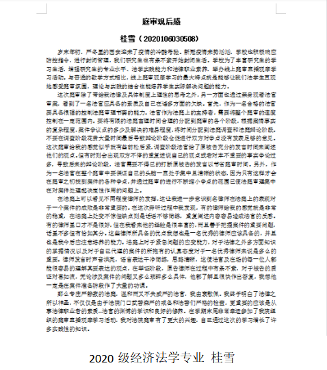 随后,20级各专业研究生纷纷就所观摩庭审撰写学习感受,从案件基本情况、涉案证据梳理、法律适用分析、争议焦点思考、学习心得体会等各方面积极总结学习心得,就庭审直播活动所学知识进行进一步巩固思考。