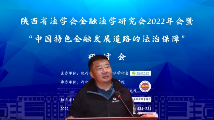 向各位领导、学者、金融工作者长期以来对学校的支持和帮助表示衷心的感谢,对各位与会嘉宾表示热烈欢迎和新春祝愿,对陕西省法学会金融法学研会近年来所取得的一系列学术成果和为促进金融法学理论研究、金融法学的繁荣与发展、推动金融法治建设做出的重要贡献给予高度评价和充分肯定。随后由中国法学会银行法学研究会会长、中国政法大学王卫国教授致辞,王卫国教授代表中国法学会银行法学研究会对本次会议的召开表示祝贺,并表达了希望继续与陕西省法学会金融法学研究会多多合作、共襄盛举、报效国家的由衷期许。王卫国教授就中国法学会银行法学研究会近年来的重点工作进行了详细介绍,结合习近平总书记在党的二十大报告中明确了新时代我国金融法治建设的重点任务的相关论述指出在我国未来一段时期的金融法治建设中,强化和完善金融监管体系是一个具有中心地位的主题。王卫国教授详细回溯了我国银行业立法的历史进程,指出正在公开征求意见的《中华人民共和国金融稳定法(草案)》是一部以治理金融风险为目标的纲要性立法,中国法学会银行法学研究会正在组织力量,撰写金融稳定法草案的修改建议,希望为这个重要的立法工程添砖加瓦。接下来由中国商业法研究会会长、北京大学法学院甘培忠教授代表中国商业法研究会致辞,甘培忠教授在致辞中指出,商业法和金融法是社会主义市场经济建设发展重要的制度保障,在学术研究的最终价值选择及研究领域、研究方法等层面有着巨大的相同性和互补性,有着同一片广阔的学术蓝天。现今国内外宏观经济形势正面临百年未有之大变局,习近平总书记在党的二十大报告中强调,要加强和完善金融监管,强化金融稳定保障体系,将各类金融活动全部纳入监管,这为商业法和金融法研究提出了问题导向的重要学术命题。相信在各位专家学者的共同努力下本次会议将取得圆满成功。陕西省法学会党组成员、一级调研员樊志来先生在致辞中对本次年会的召开表示热烈祝贺,指出陕西省法学会、金融法学研究会积极组织学术交流研讨为陕西省金融法治建设做出了积极贡献,并代表省法学会对金融法学研究会的发展建设提出多点期冀。樊志来先生指出本次研讨会是陕西省法学会建设的大事,会议议题政治方向正确,抓住了金融法治理论和实践问题的关键,必将取得丰硕的研究成果。陕西省地方金融监督管理局党组成员、副局长张荣辉先生在致辞中对金融法学研究会近年来做出的贡献和努力表达了肯定与感谢,并对金融法治建设发展提出坚持党对金融工作的集中统一领导、为中国特色金融发展之路提供法治保障、守正创新加快构建陕西特色金融法治体系、发挥金融法学研究会的智库功能积极参与陕西金融法治建设四点建议与大家共勉。中国证监会陕西监管局党委委员、副局长李国强先生对本次会议的召开表示祝贺,指出法治建设在资本市场建设中发挥了不可磨灭的作用,强调了资本市场改革发展和法治建设相辅相成的关系,对陕西省法学会金融法学研究会在促进陕西资本市场发展等方面的作用给予了高度肯定,表示对本次研讨会充满期待并预祝会议圆满成功。