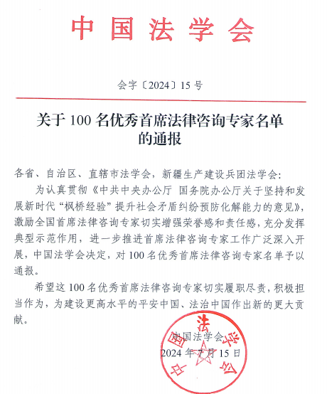 为激励全国首席法律咨询专家的工作积极性、主动性,切实增强荣誉感和责任感,充分发挥典型示范作用,进一步推进首席法律咨询专家工作广泛深入开展。中国法学会对100名优秀首席法律咨询专家进行通报表扬,并颁发证书。