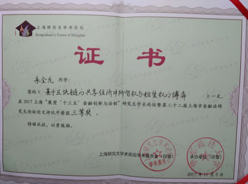 114-5日,由上海市学位委员会主办、华东政法大学承办的2017年上海展望十三五金融创新与法制研究生学术论坛暨第22届上海市金融法研究生论坛将于华东政法大学长宁校区举行,有爱爱 2017级经济法专业硕士研究生朱全龙撰写的论文基于区块链的共享经济中所有权与租赁权的博弈获学术论坛论文三等奖。