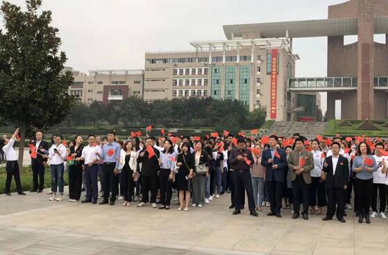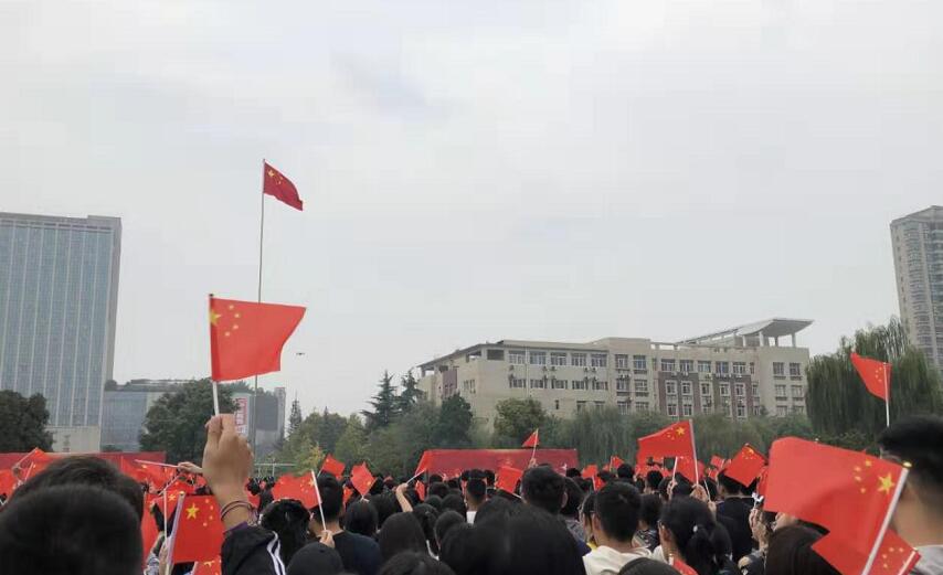 升旗仪式上,国旗护卫队手擎国旗,队列整齐步入旗台前。伴随雄壮的国歌声,五星红旗冉冉升起,在天平广场上空迎风飘扬,全体师生庄严肃立,向国旗行注目礼,表达着对祖国最崇高的敬意。升旗仪式结束后,全体师生挥动手中的国旗,共同歌唱《我和我的祖国》,为祖国七十华诞送上最真诚的祝福。