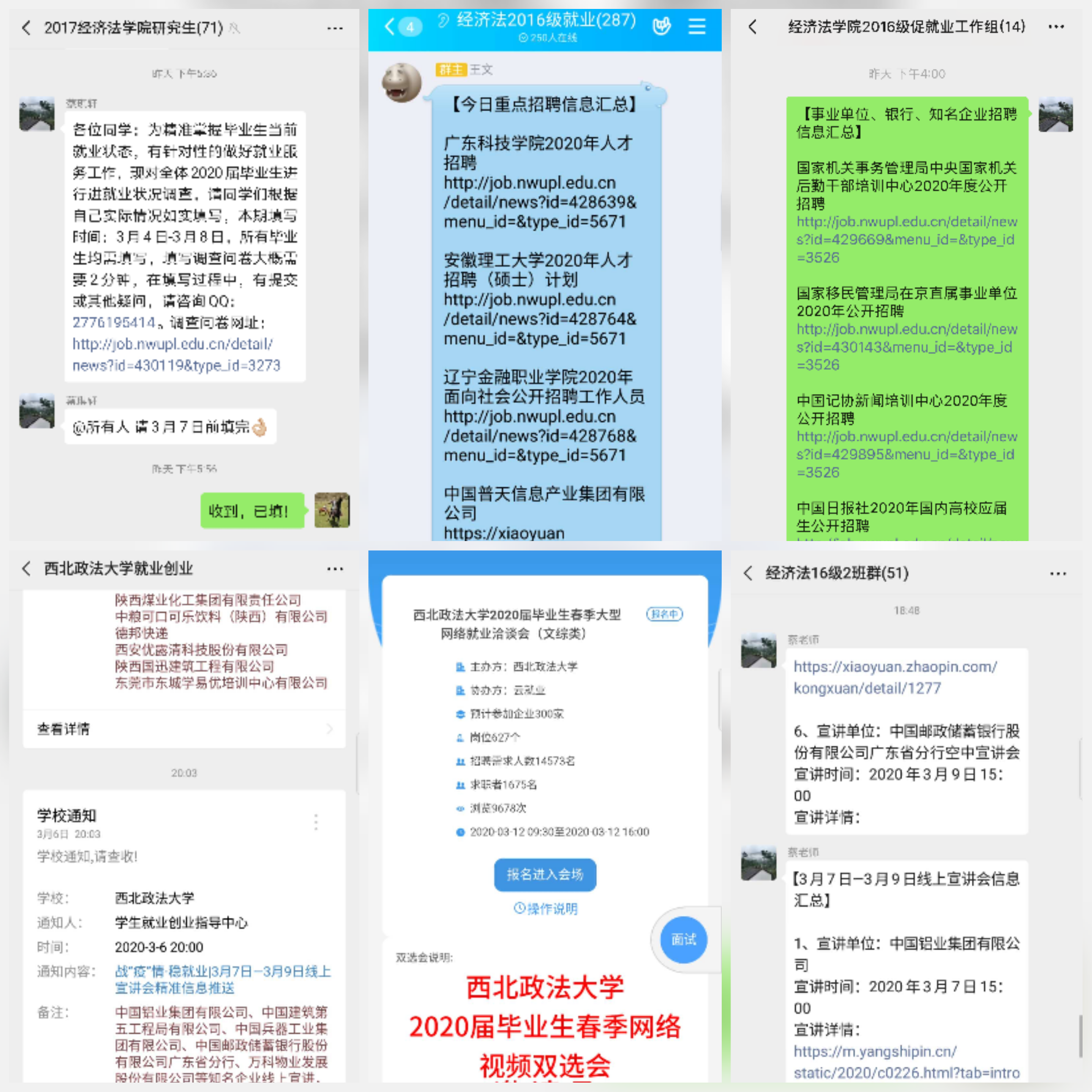 1.多途径收集就业信息。①学院安排专人搜集有关企业春招、研究生复试、公务员考试、事业单位及选调生报名安排等各类通知、公告信息;②学院研究生导师、本科生导师以及专业骨干老师,充分发挥社会影响力、利用社会资源,通过校友等多渠道收集各类就业信息。