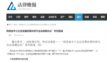 院长义海忠教授以《民营企业(中小企业)合法权益保障的路径考察》为题,对《若干意见》中“建立和健全中小企业合法权益保护制度”进行分析和论述。强力教授解读了《民法典》与中小企业发展的关系问题,认为要充分认识中小企业发展保障的意义和作用。杨为乔副教授分享了关于中小企业融资保障和促进法治完善的分析和思考。论坛受到今日头条、西部法治网、法律晚报、中小企业IT网等多家媒体的广泛关注与报道。