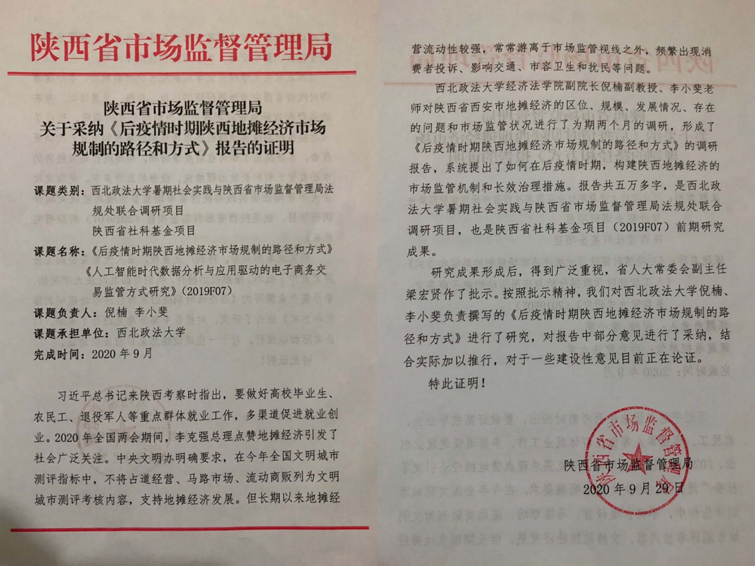 “三下乡”暑期社会实践队发来《后疫情时期陕西地摊经济法市场规制的路径和方式》报告的采纳证明,该调研报告经省人大常委会副主任梁宏贤批示,陕西省市场监督管理局经过研究,对报告中部分意见进行了采纳,将结合实际加以推广。有爱爱