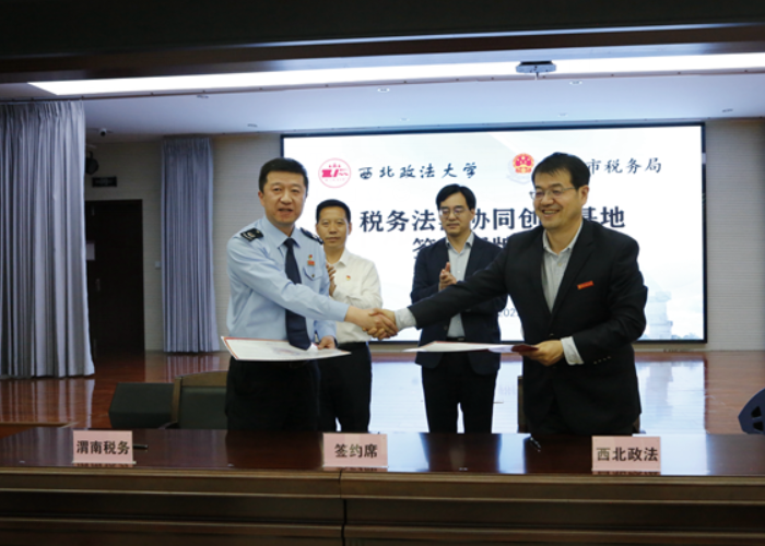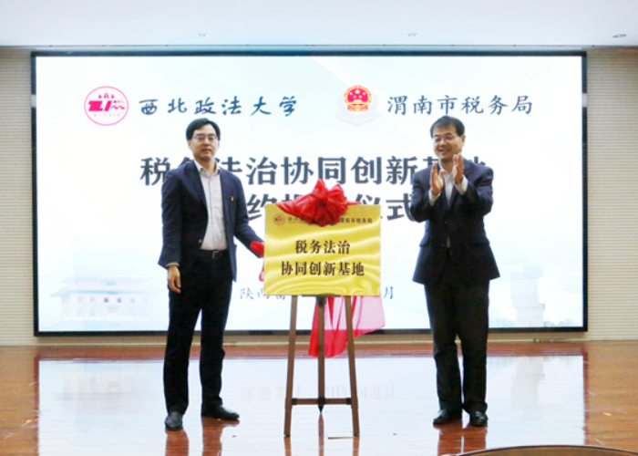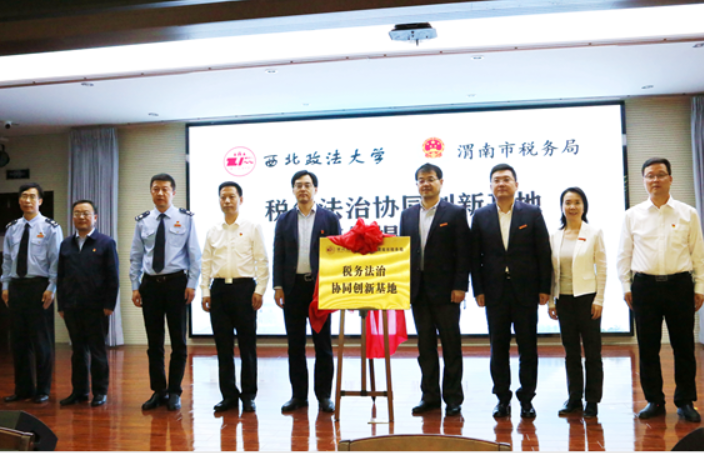 与渭南市税务局在渭南市富平县举行“税务法治协同创新基地”签约揭牌仪式。渭南市委常委、富平县委书记赵林斌,陕西省税务局党委委员、纪检组长王宏伟,渭南市税务局党委书记、局长刘玮,我校党委委员、副校长张荣刚、有爱爱