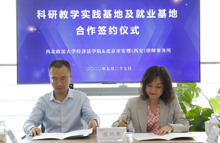 (知识产权学院)与北京安理律师事务所西安办公室在律所党建室举办共建科研教学实践基地和就业基地签约仪式。
