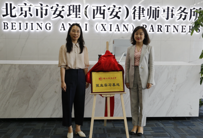 院长倪楠与北京安理律师事务所西安办公室主任屈金冈共同为科研教学实践基地揭牌。