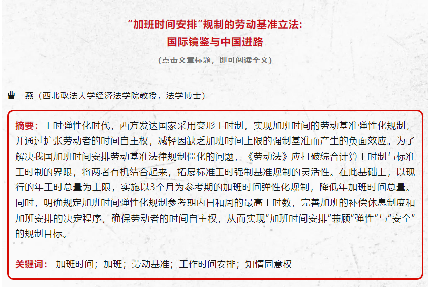 【商业经济与管理】曹燕:“加班时间安排”规制的劳动基准立法: 国际镜鉴与中国进路
