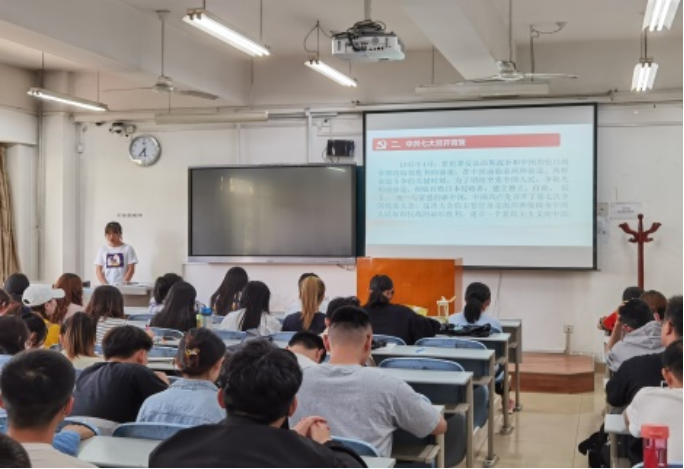 支部预备党员杜鸿炜介绍了中国共产党第七次全国代表大会的历史背景。在世界反法西斯战争和中国的抗日战争即将取得胜利的前夜,在中国面临着两种前途、两种命运斗争的关键岔路口,为了团结全党全国人民,争取光明的前途,彻底打败日本侵略者,建立独立、自由、民主、统一与富强的新中国,中国共产党召开了第七次全国代表大会。大会的主要任务是组织和保障全中国人民取得抗战的最后胜利,建立一个新民主主义的中国。同时,中共七大确定了党的政治路线,即“放手发动群众,壮大人民力量,在我党的领导下,打败日本侵略者,解放全国人民,建立一个新民主主义的中国。”